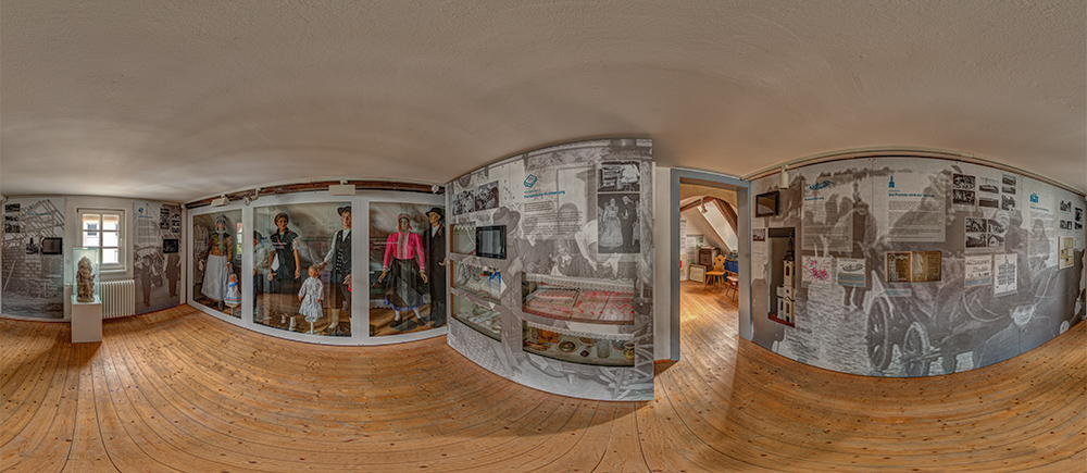 Der vordere Raum zur Straße hin ist der Landsmannschaft der Donauschwaben gewidmet. Hier bieten historische Karten,Akten, Dokumente, Zeugnisse, Meister-briefe und Bilder einen Einblick in die Geschichte der Donauschwaben die von Vertreibung, Flucht und der Eingliederung in die neue Heimat geprägt ist. Trachtengruppen und Gebrauchsgegenstände veranschaulichen das tägliche Leben der Donauschwaben in der alten Heimat.