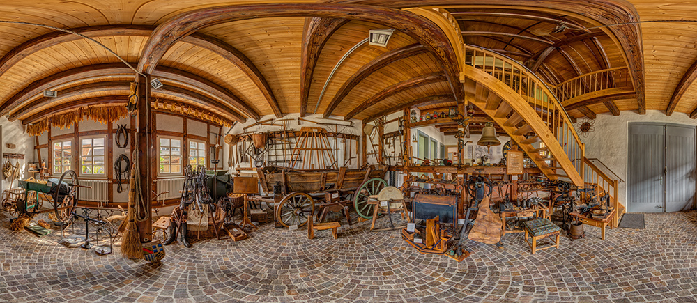 An den Wohnkomplex schließen sich die Scheune und die ehemaligen Stallungen an. Die zahlreichen verschiedenen Geräte und Werkzeuge, die hier zu besichtigen sind, wurden in der Landwirtschaft sowie bei anfallenden Arbeiten in Haus und Hof verwendet. Zu sehen ist hier auch eine Schuhmacherwerkstatt.